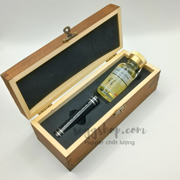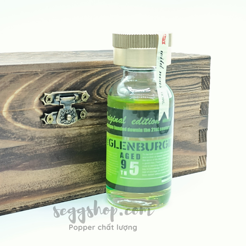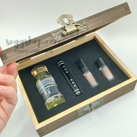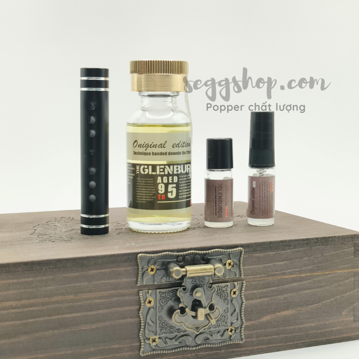 Là sản phẩm của hãng Glenburgie Edition nổi tiếng trong cộng đồng LGBT, với lối thiết kế hộp đựng bằng gỗ có khóa rất sang trọng và hấp dẫn, bên trong là hộp là gồm 1 lọ thủy tinh được kết cấu rất chắc tay chứa đựng dung dịch hít popper 30ml và 1 ống hít bằng thép để bạn có thể chứa đựng popper mang đi dễ dàng hơn, sử dụng thông qua ống hít popper giúp giảm thiểu tình trạng bị vây popper vào mũi.